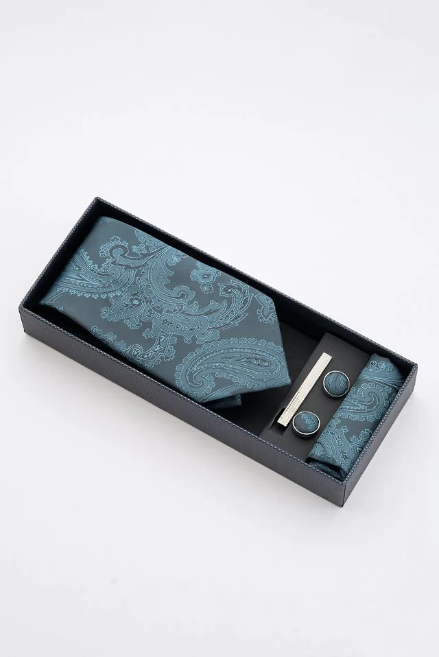 A striking teal paisley tie set complete with a matching pocket square, silver tie bar, and cufflinks. Bold yet sophisticated, this set adds a refined touch to both formal and semi-formal looks.