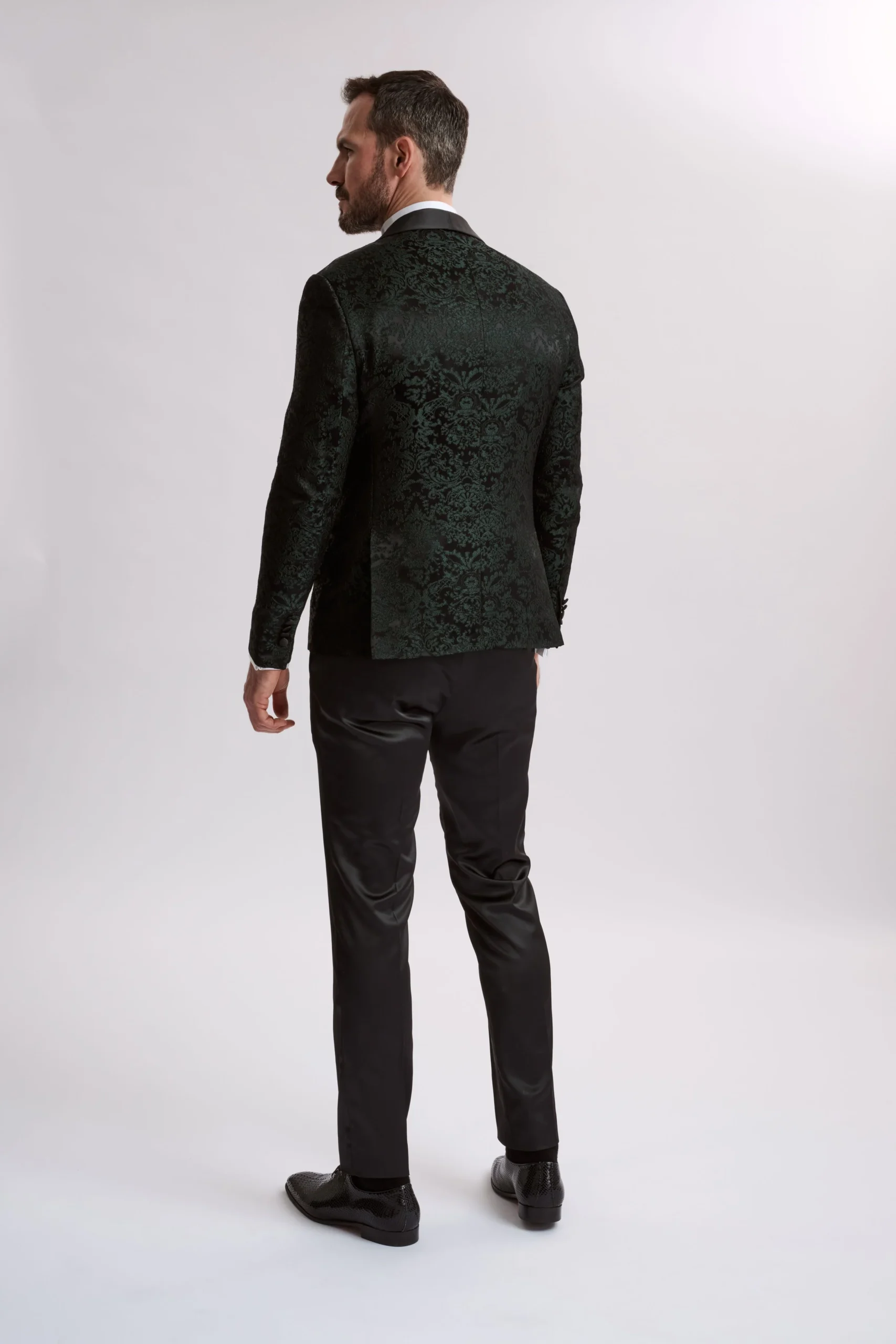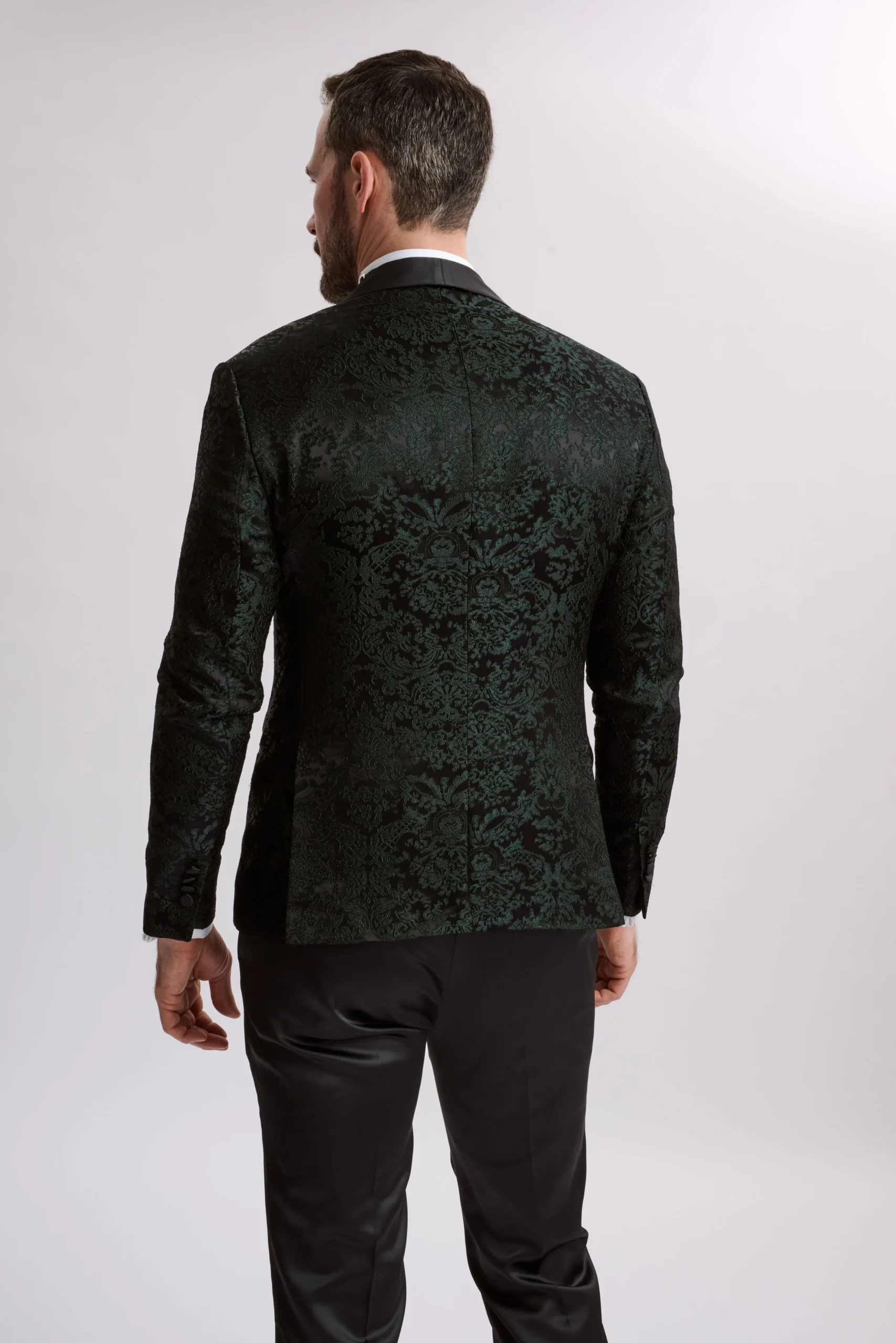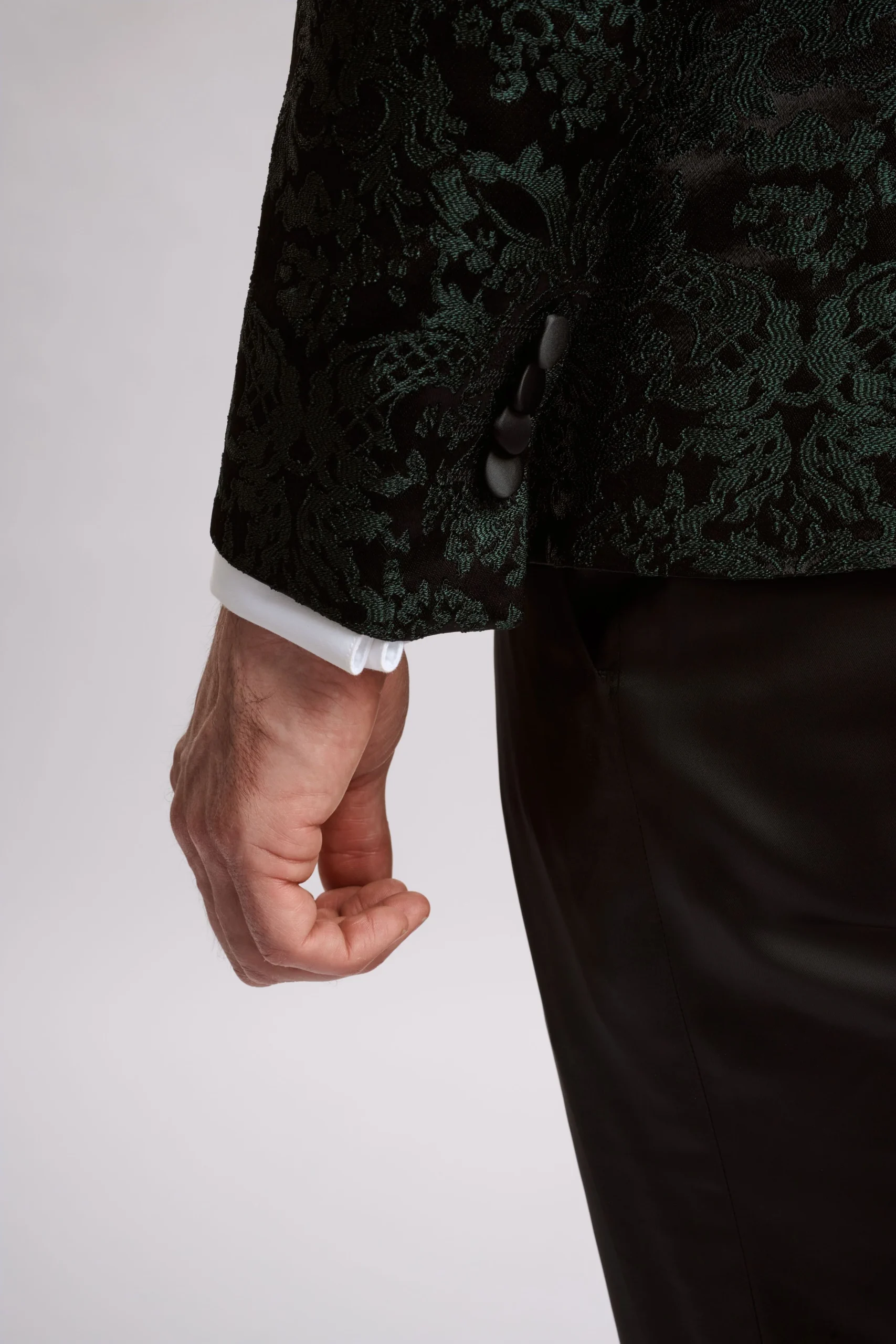 Elevate your presence. Make a statement. Experience the perfect harmony of tradition and contemporary luxury with this iconic olive brocade suit.