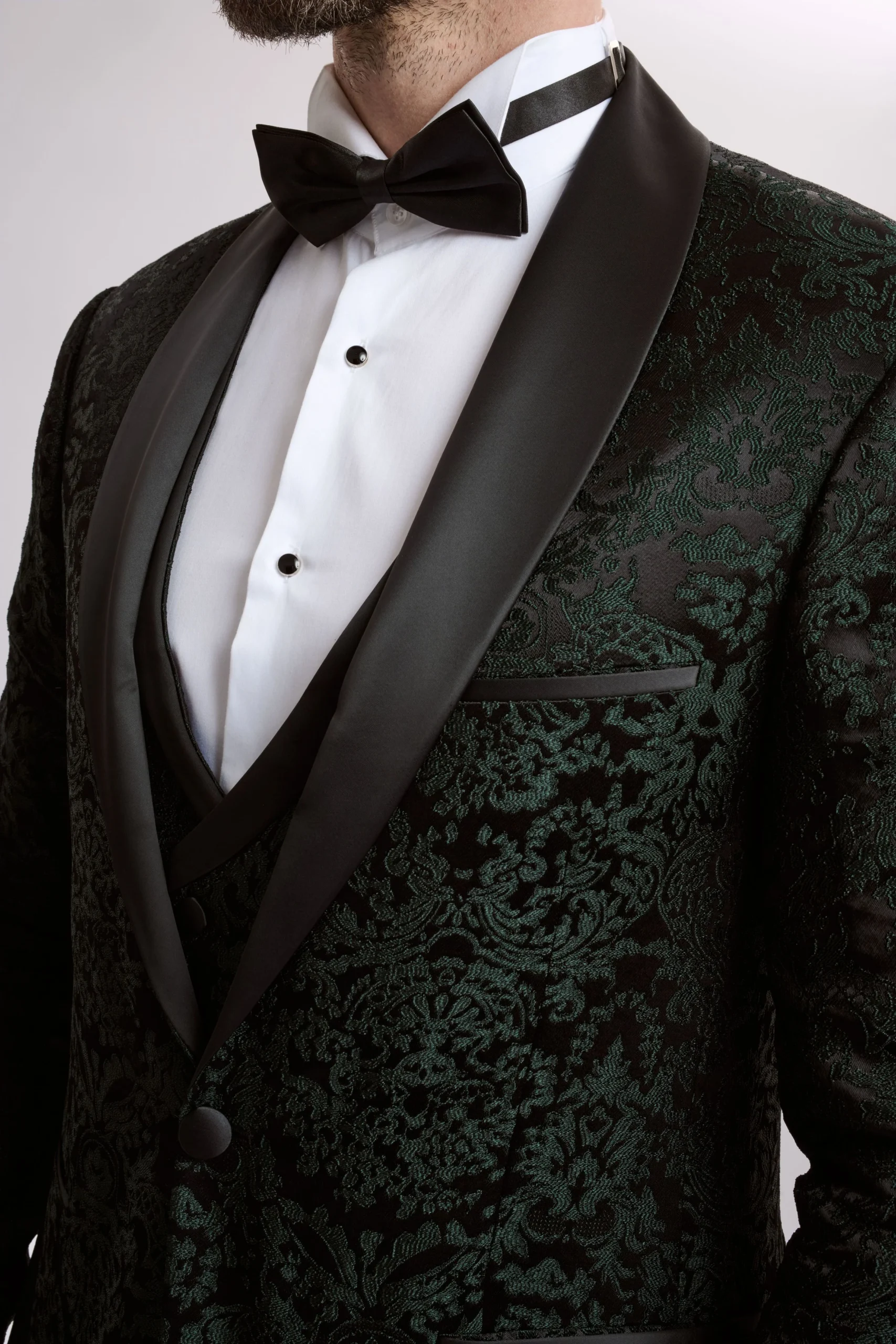 Discover the epitome of luxury and style with Santoro Milan’s Paisley Three-Piece Brocade Olive Suit. This textured suit is a masterpiece of design and craftsmanship, perfect for the discerning gentleman who appreciates the finer things in life.